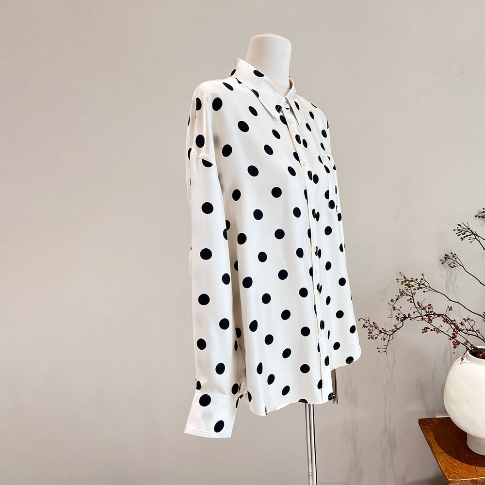 Mejora tu vestuario diario con esta lujosa camisa de seda para mujer, con una base blanca atemporal y llamativos lunares negros. Hecha 100 % de seda, ofrece una textura suave y un brillo natural que aporta elegancia a cualquier look. El diseño incluye cuello clásico, bolsillo en el pecho y cierre de botones, con mangas largas que se pueden remangar para un look más relajado. Ligera, transpirable y con un estilo informal, es perfecta para días de trabajo, brunchs de fin de semana o momentos chic en una cafetería.